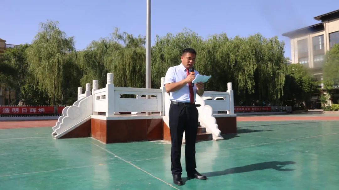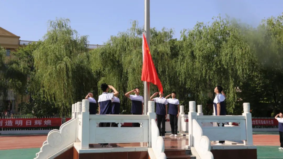 欢送仪式在雄壮的国歌中拉开序幕,同学们行注目礼,升国旗,唱国歌。