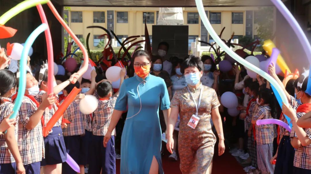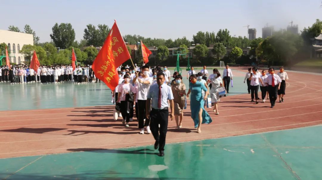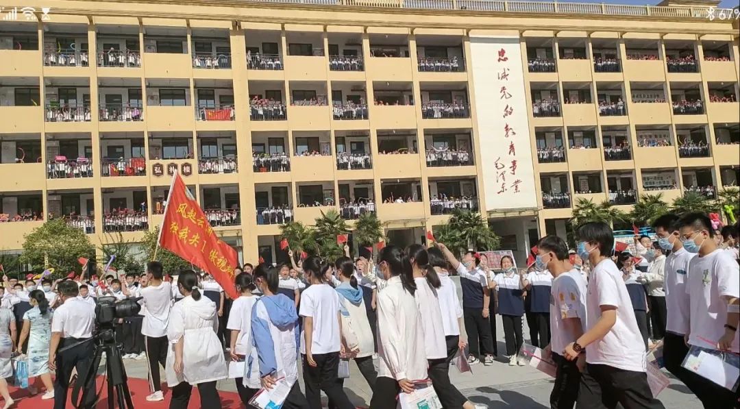 旗开得胜,一举成名!周口高中校长石朵身着旗袍带领师生走红毯。全校师生沿红毯列队欢送,举着醒目的励志标语,挥舞着红旗,全力地呐喊助威:“高考加油”“金榜题名”“新星高考 一战成名”……群情激昂,铿锵有力的祝福声和助威声响彻校园,让高三学子热血沸腾。